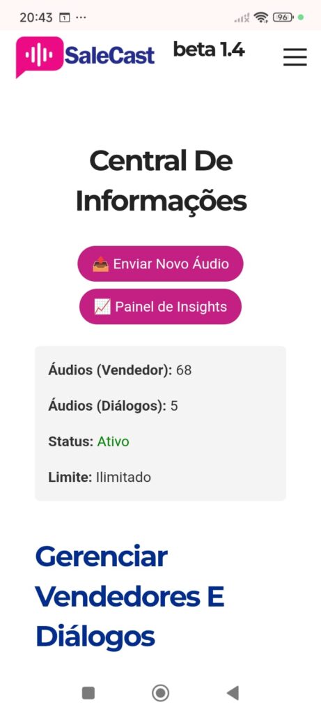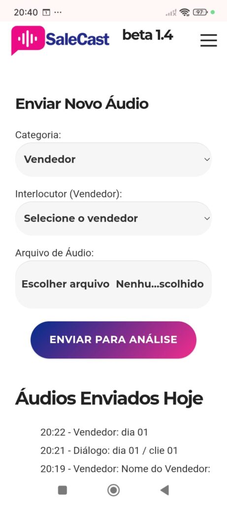 Com a SaleCast, você analisa conversas reais da sua equipe de vendas e recebe insights imediatos sobre objeções, falhas de abordagem e oportunidades desperdiçadas — tudo com o poder da inteligência artificial.